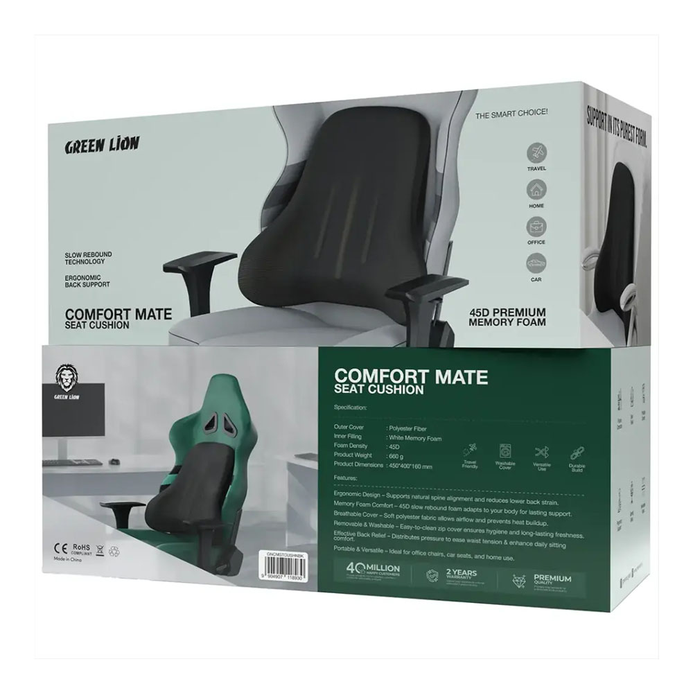 The Green Lion Comfort Mate Seat Cushion in black provides perfect comfort and support for multiple requirements. The product consists of a polyester fiber outer cover, which provides both softness and durability. The inner filling consists of 45D premium white memory foam, which delivers both comfort and support while keeping the cushion’s original shape. The foam uses slow rebound technology to shape itself according to your body shape while providing maximum pressure relief. The product serves as an excellent solution for correcting posture and relieving back pain during extended periods of driving, office work, or gaming sessions. The cushion serves as a lightweight travel solution that you can easily transport to any destination. The fabric of the product allows air circulation to your body while its washable cover provides an effective method for maintaining cleanliness. The product supports pregnancy by reducing lower back pressure, which enables all-day comfort during work activities, travel time, and gaming sessions.