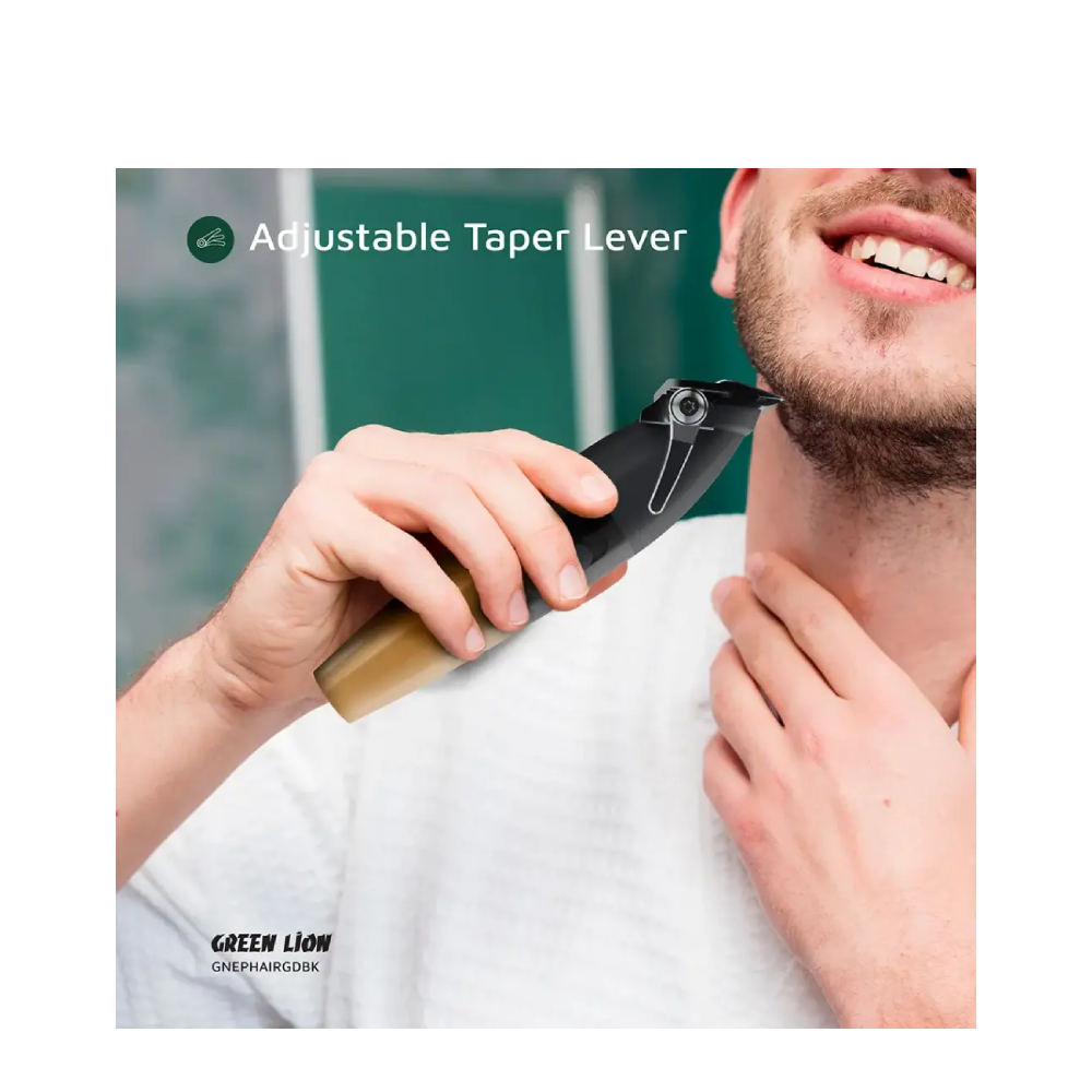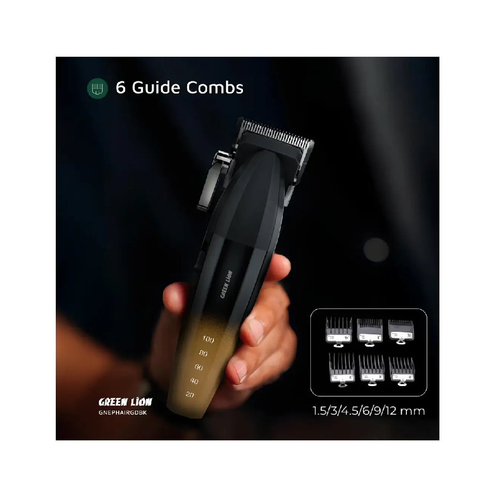 The Green Lion Edge Pro Hair Clipper-Gold Black stands up as a tool of great performance for grooming purposes and carries an air of precision plus convenience. The clipper holds a sturdy ABS plastic body with stainless steel materials for operations that are smooth and long-lasting. The DC brushed motor delivers powerful performance at 9100 RPM for razor-sharp, clean cuts. It owns an abundance of a 2500mAh giant battery capacity, allowing a runtime of over 3 hours with one full charge, suitable for various grooming sessions. Featuring Type-C charging, the clips give quick recharging and can be ready within 3 hours. The adjustable taper lever allows you to change the cutting lengths easily, and with 6 size guide combs (1.5/3/4.5/6/9/12 mm) at your disposal, you are set for any hair style adjustment. Equipped with a battery indicator and provided in an ergonomic form, it caters to comfortable use, having become the quintessential and versatile grooming tool.
