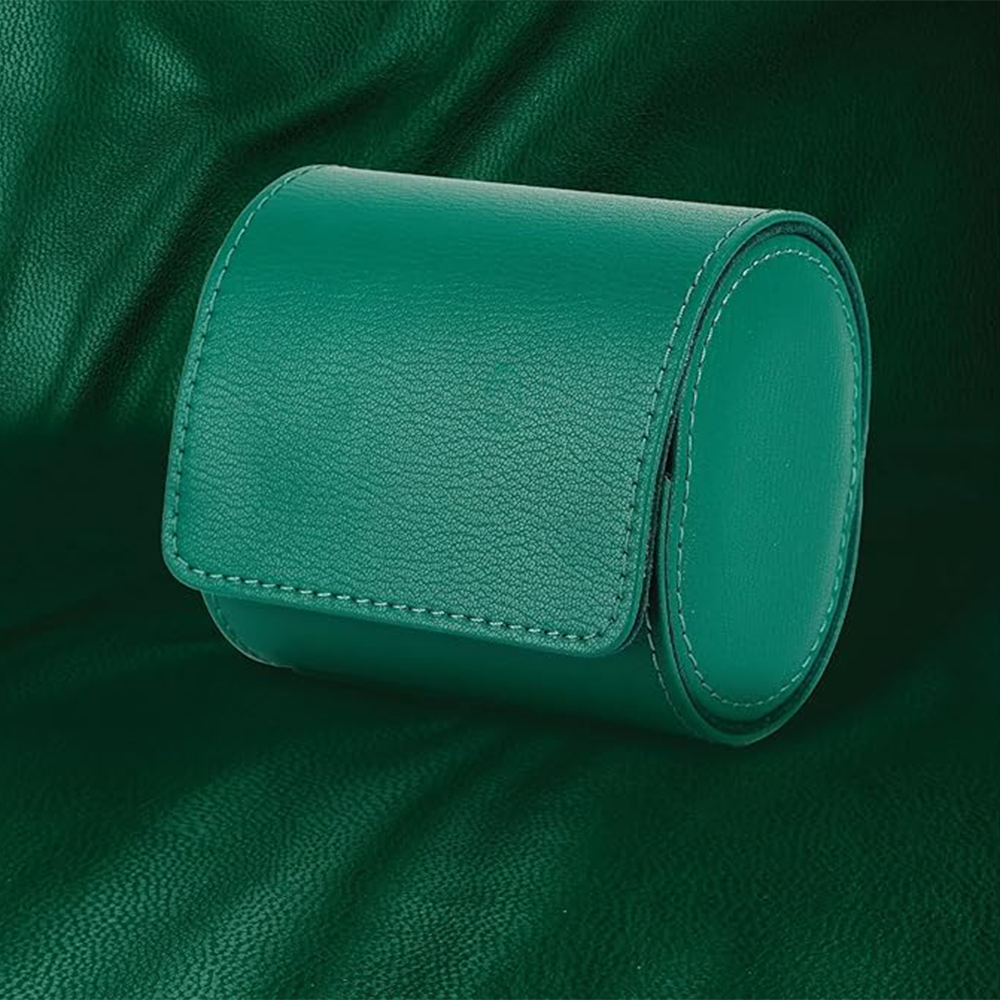 This Rolex green watch case is refined for watch enthusiasts and functional in purpose. Elegance and durability are reflected in this genuine leather watch case, and the grey velvet inside creates a soft cushion of protection for added security around your prized possession. Designed to hold one watch securely, this petite case has a shoulder snap for easy access. Because everything inside is wrapped in soft velvet, your watch stays protected and free of scratches and bumps during travel or when put away. The included watch pillow keeps the watch in place and maintains its shape. This case is an elegant yet functional proposition to protect luxurious timepieces.