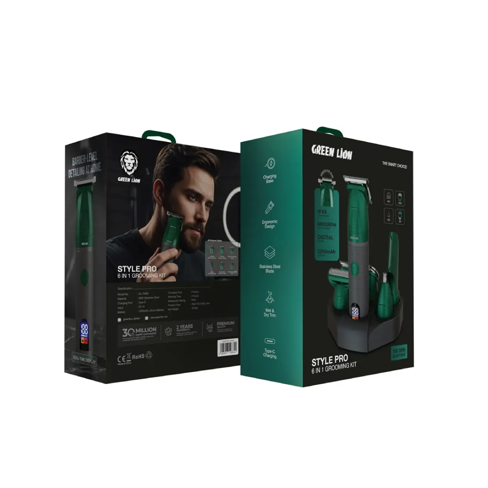 The Green Lion Style Pro 6-In-1 Grooming Kit – Green is an outstanding and multifunctional grooming tool for a contemporary man. The three interchangeable heads let you smoothly go from hair trimming to beard grooming to nose trimming. A built-in lamp lights up the area of precise grooming, and a smart digital display indicates the battery status and settings in real time. One can use the wet & dry trim feature in the shower or on dry hair. The USB-C charging port allows the device to be charged very fast and efficiently, while the 2600mAh battery grants 180 minutes of use on a full charge. The device is rated IPX6, which means that it can be used safely underwater. Its ergonomic design allows you comfort and convenience while grooming, thus making it indispensable in every man’s personal care routine.