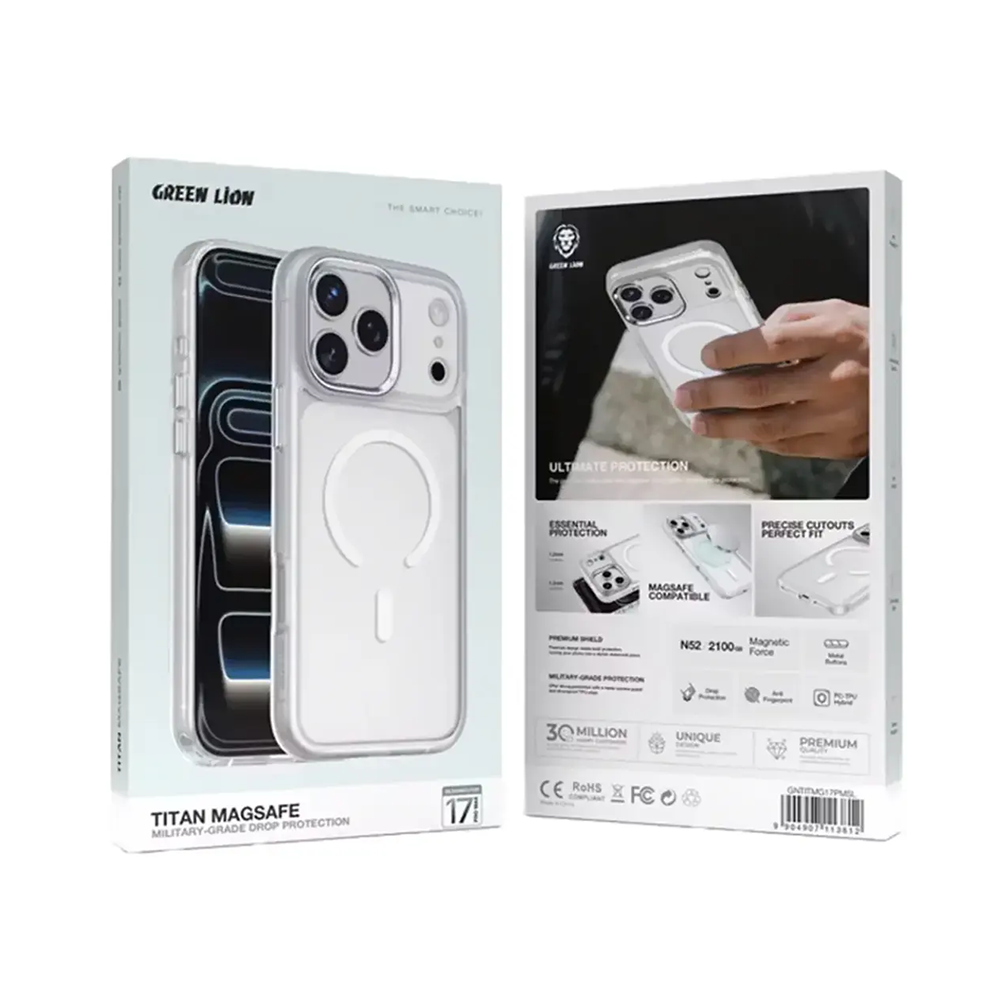 The Green Lion Titan MagSafe Military-Grade Case – Silver for iPhone 17 Pro is undoubtedly the best combination of a tough and durable protective case along with an elegant, modern case, which consequently indicates that the user obtains the most favorable combination of longevity and beauty. The protective case possesses military-grade protection and consists of a PC-TPU hybrid material with a high-quality shield as the ultimate protection for your device against falls, shocks, and the daily grind. The case’s manufacturing includes metal buttons and accurate cutouts in such a way that you can have unobstructed access to all ports and functions without compromising phone usability. The case’s fingerprint and scratch-resistant surfaces are very helpful in keeping the device looking fresh and new, while the shock-absorbing structure provides the required impact protection. Being totally compatible with MagSafe ensures an easy connection to chargers and accessories for hassle-free wireless charging. The Green Lion Titan is not only a protector for your iPhone 17 Pro but also a keeper of its chic look by offering drop protection, a comfy grip, and vital protection features. The silver color gives a luxurious and sophisticated appeal to it, hence making it a convenient and stylish choice for daily use at the same time.
