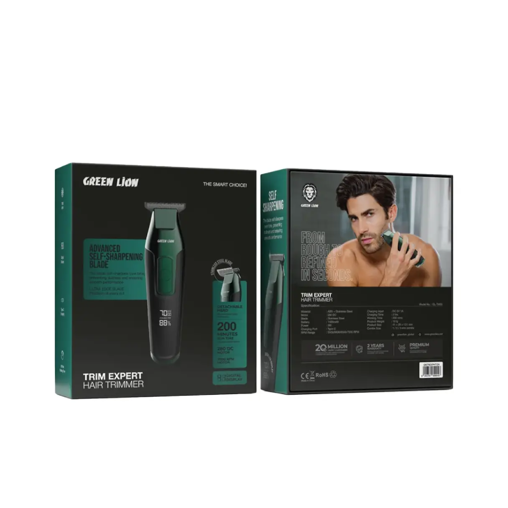 Designed for precision and convenience, the Green Lion Trim Expert Hair Trimmer is high-performance grooming equipment. It is made of a sturdy ABS body and stainless steel blades for a smooth and efficient trimming session. It powers a 280 DC motor that spins at an impressive range of 5500-7000 RPMs for swift, precise cuts. The 1400mAH battery lasts 200 minutes upon full charge and will get fully charged in 120 minutes through a Type-C charging port. While the 5W power ensures great working ability, a digital display on the device lets you monitor it easily. It is great for home or professional use and will give you sharp, clean cuts every time. With the stainless steel blade, ergonomic body, and powerful motor, the Green Lion Trim Expert Hair Trimmer will guarantee you fantastic grooming anytime.