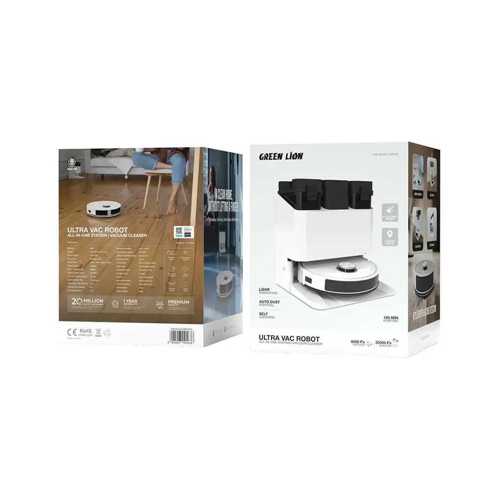 The Green Lion Ultra Vac Robot All-in-One Station and Vacuum Cleaner is a state-of-the-art and all-inclusive cleaning system that aims to provide the highest level of comfort as well as cleaning efficiency. This robotic vacuum cleaner comes with a 5200mAh and 14.4V Li-Ion battery; hence, the battery has the ability to last up to 160 minutes and is also equipped with the latest LiDAR-based navigation system, which cleans with maximum accuracy. The device boasts a suction power of 8000Pa for the robot and 25000Pa for the station to perfectly remove dirt and to gather waste super quickly. Furthermore, it is meant for a space of 140m², and the features of self-drying, self-emptying, and self-washing all the time make it ready for the next job. Moreover, the station is equipped with a 3.5L water tank and a 3L sewage tank for quick mopping and dust disposal. Thanks to Wi-Fi connection, the robot can be controlled remotely, and the intelligent obstacle avoidance system ensures that the operation is not interrupted even if there is furniture or other obstacles in the way. The cleaning time is constrained to 65dB or less in quiet mode, resulting in a powerful, silent, and stress-free cleaning experience.