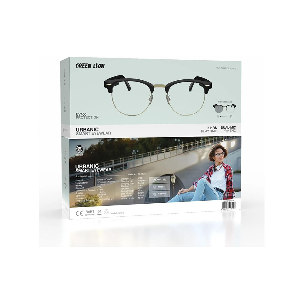 The Green Lion Urbanic Smart Eyewear is a cutting-edge accessory that combines fashion and functionality for the modern lifestyle. These smart glasses havephotochromic lenses that provide UV 400 protection. They adjust to different lighting conditions, giving you clear vision and comfort anywhere. The Urbanic Smart Eyewear has Bluetooth V5.4. It supports hands-free callsand hasdual microphonesfor clear voice capture. Plus, it includes aremote camera for easy photo-taking. The eyewear featuresTWS functionality. It providesimmersive sound with 10mm speakers. You can enjoy up to 5 hours of playtime or talk time. The ergonomic design features a lightweight, sturdy frame made ofmetal, PC, and ABS. It has a comfortable bridge width and adjustable temple length. Charging is quick and convenient with the magnetic charging feature, requiring only 1.5 hours to fully charge. The Green Lion Urbanic Smart Eyewear has an IPX4 waterproof rating. It is made for all-day wear, perfect for outdoor events or daily use.