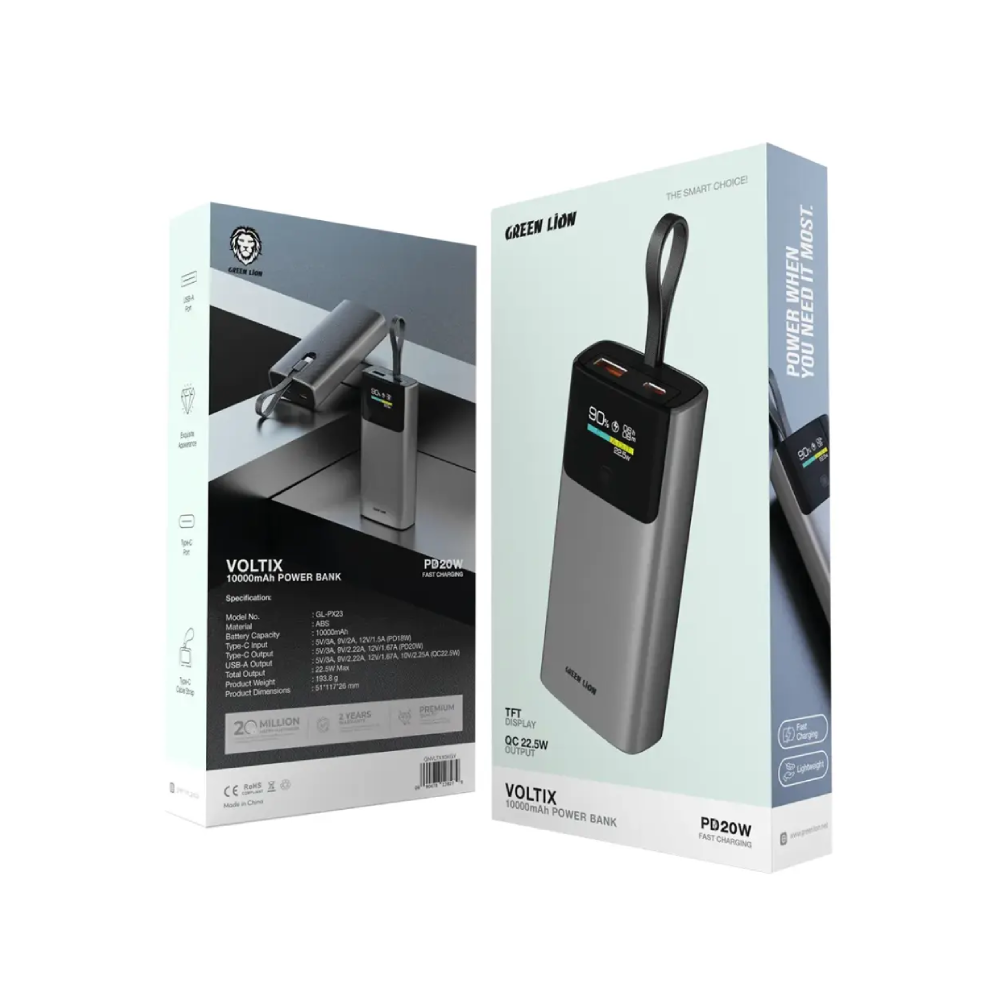 The Green Lion Voltix 10000mAh Powerbank PD20W in Grey is a tiny yet powerful power bank that keeps your devices charged. This power bank is constructed with durable ABS material and boasts a 10000mAh battery capacity for longer-lasting energy. Type-C input and output (PD20W) means the power banks support fast charging, delivering 5V/3A, 9V/2.2A, and 12V/1.67A for a quick and safe charge. There is an included Quick Charge 22.5W with USB-A output for rapid power charging of suitable devices. In fact, this power bank has USB-A and Type-C ports, an elegant slim body with a TFT display for easy monitoring of the charge status, and a Type-C cable strap. It is a very dependable portable solution for all your charging needs.