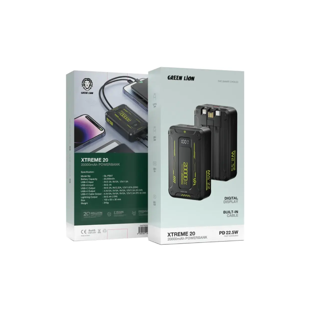 The Green Lion Xtreme 20 Power Bank is an ultra-efficient, ultra-fast, and ultra-modern portable battery charger with 20,000mAh of sheer capacity. Its capable PD 22.5W output ensures that many devices charge quickly. It has USB-C and USB-A inputs, while its many outputs include USB-C, USB-A, and a built-in Lightning cable. The LEDs display real-time battery levels. This power bank, designed with portability and it has the feature of an ultra-slim casing with built-in cables. It is the complete answer to mobile phones, tablets, and other gadgets requiring a reliable and super-fast charging solution for traveling or daily use.