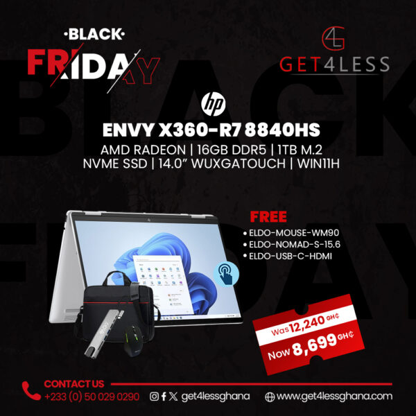 HP Envy X360 R7 8840HS 16GB RAM DDR5 1TB SSD AMD Radeon 14.0 Inches Touchscreen Silver with Free Eldo Pro USB-C To HDMI 8 Port Adapter, Eldo WM90 Mouse and Eldo Pro Laptop Bag 15.6