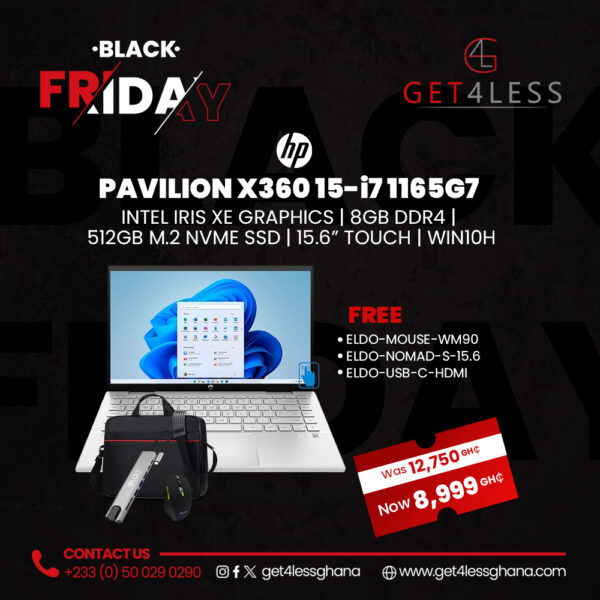 HP Pavilion X360 15-Core i7 G11 8GB RAM 512GB SSD 15.6″ Touch with Free Eldo Pro USB-C To HDMI 8 Port Adapter, Eldo WM90 Mouse and Eldo Pro Laptop Bag 15.6