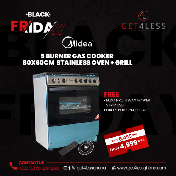 Midea Gas Cooker 5 Burner 75 x 60 cm Stainless Oven + Grill Free Eldo Power Strip and Haley Scale