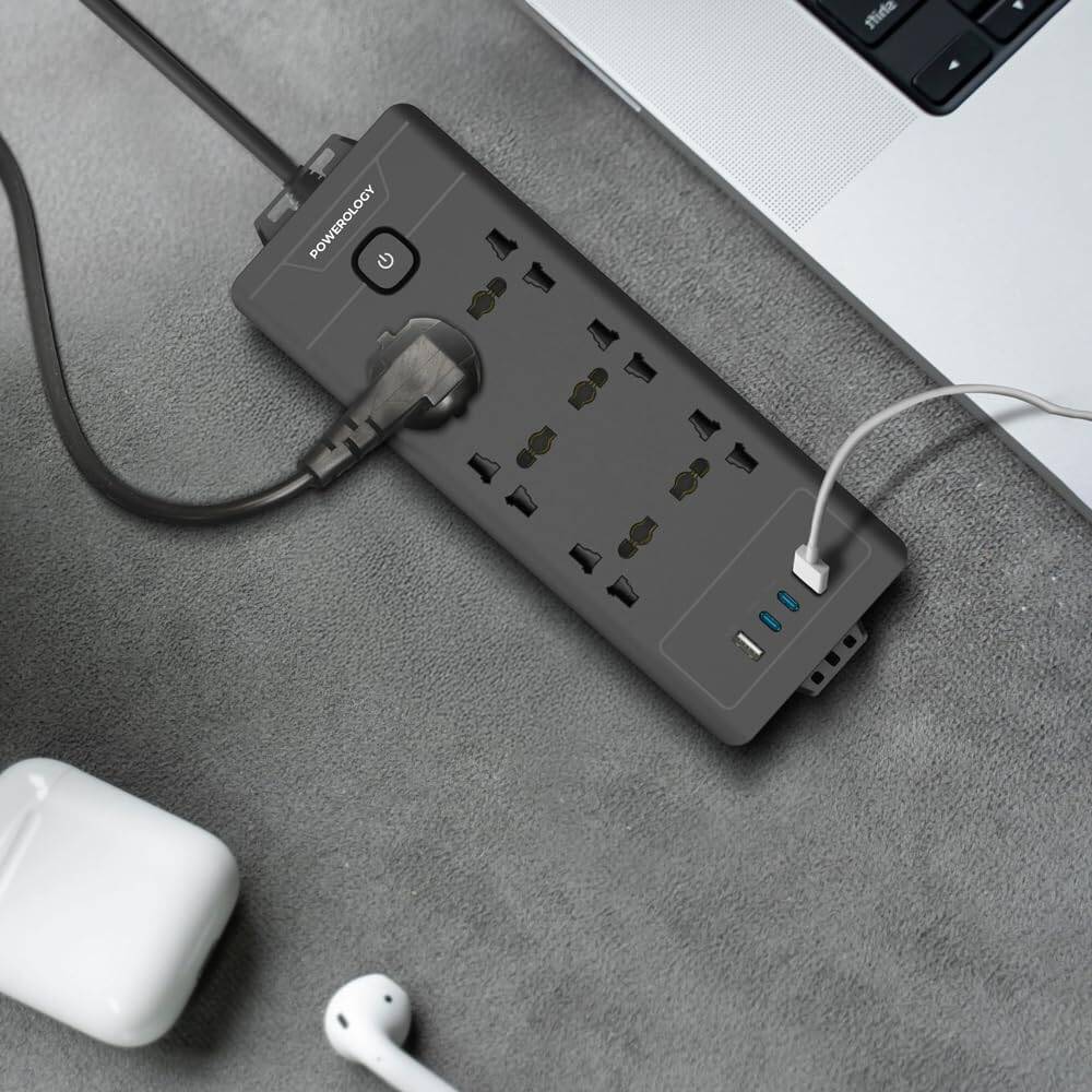 The Powerology 6AC 2500W Power Strip is a universal and high-speed charging strip that can accommodate all your power needs. It has a universal input of 110-240V and 50/60Hz and is perfectly suitable for home use, office use, or travel. The power strip supports 4 USB ports, two USB-C ports with 20W each, and two USB-A ports with 18W each, and accommodates fast charging of smartphones, tablets, and other devices. Both ports are available simultaneously with a combined output of 15W. High-power appliance compatible 2500W AC output (250V/10A) ensures secure usage with appliances of high power, and a 3-meter UK plug provides placement convenience. Made of fire-proof material with safety power switches and built-in protection mechanisms, it provides safe and secure use. No matter if you need to charge multiple devices or power heavy-duty equipment, the Powerology 6AC Power Strip offers efficiency, safety, and convenience all in one compact unit.