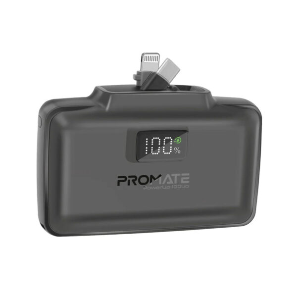Introducing PowerUp-10Duo, a revolution in portable power and another first-to-market product from Promate, with an unprecedented capacity-to-size ratio. This sleek, mini power bank packs serious energy thanks to a powerful 10,000 mAh battery, which provides double the power versus other mini power banks available in the market. With built-in foldable 20W USB-C™ and Lightning connectors, plus an additional 20W USB-C™ in/out port, it effortlessly charges multiple devices at lightning-fast speeds. The LED battery display keeps you informed, while advanced overcharging and overheating protection ensure safety with every charge. Designed for life on the go, the PowerUp-10Duo fits seamlessly into your pocket or bag and even features a convenient integrated kickstand, making it the perfect travel companion. Stay charged, stay ready, and stay ahead with Promate.