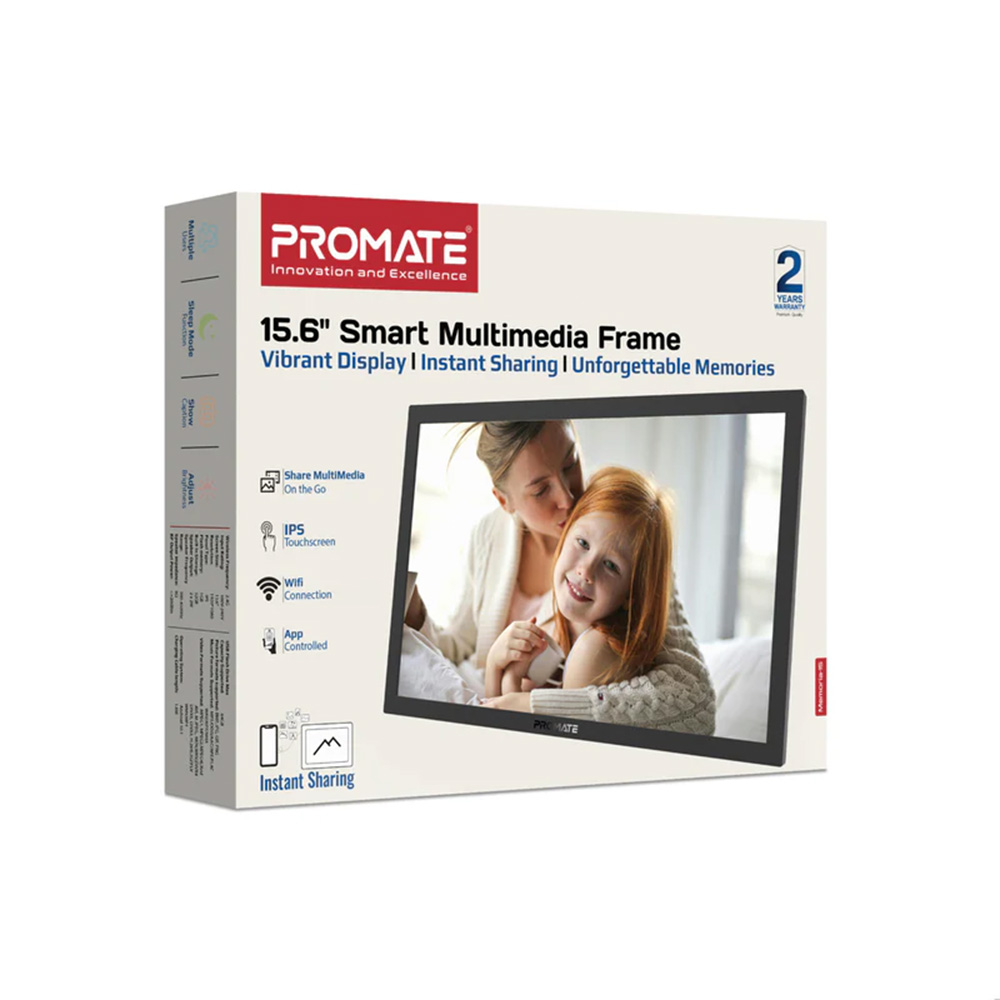 Transform the way you showcase your memories with Memoria-15 by Promate. This Full HD 15.6” touchscreen digital photo frame combines elegance and innovation to keep your cherished moments alive. Its stunning 1920×1080 resolution displays every photo in vibrant clarity, while the 32GB built-in storage and wireless connectivity ensure your favourite memories are always at your fingertips. Equipped with smart features, USB/TF card support, and Android 10.1 compatibility, Memoria-15 offers effortless integration and unparalleled versatility. Dual speakers enrich your experience with sound, making it perfect for videos or slideshows. Crafted with a sleek design, it seamlessly blends into any décor, turning your favourite moments into a timeless display.