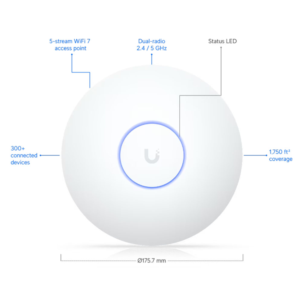Compact, ceiling-mount WiFi 7 AP with 5 spatial streams and extended signal range.
